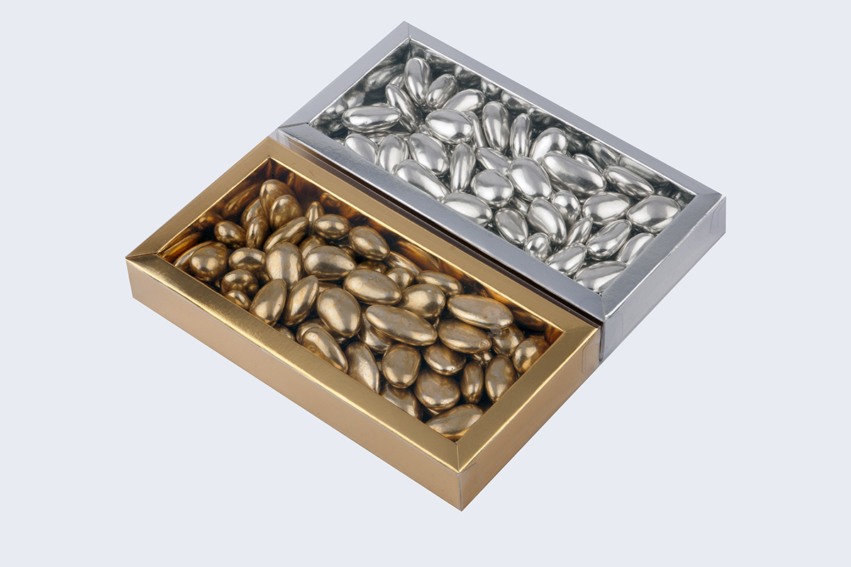 Almendras doradas y plateadas cubiertas con una fina capa de chocolate